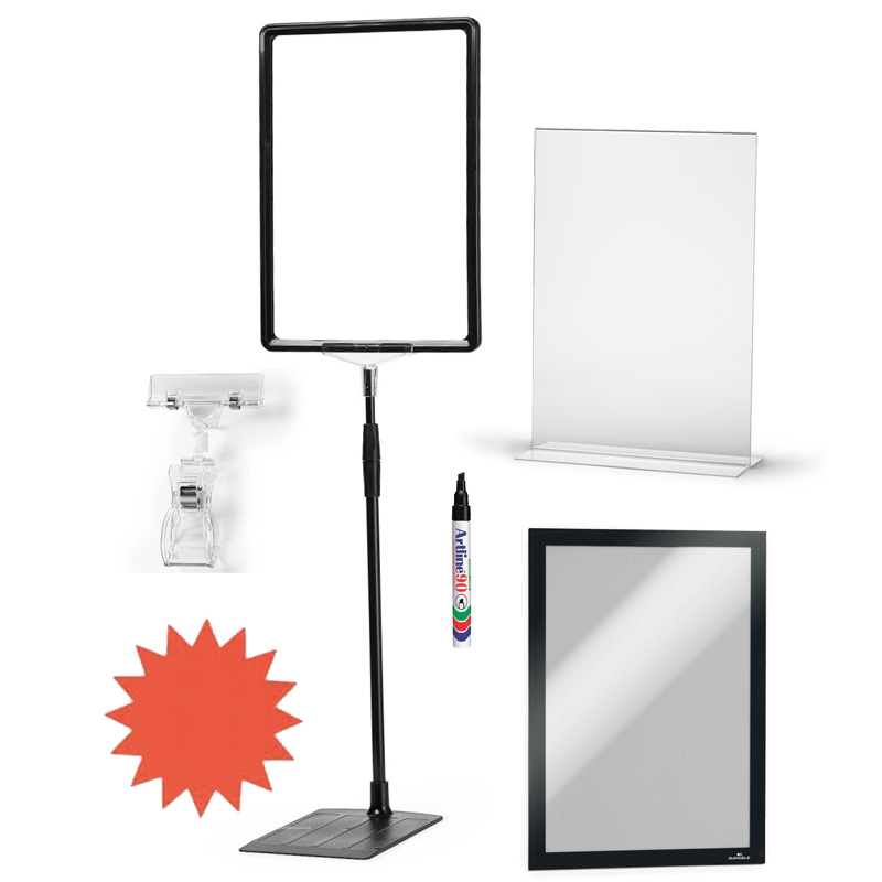 Informationsställ och Skyltramar med tillbehör. Skyltpapper och Pennor.