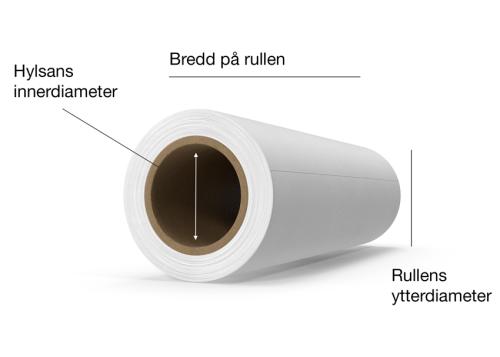• Rullens bredd (mm), max ytterdiameter (mm), hylsans innerdiameter (mm) och mängd papper på rullen (m).