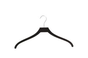 Svart plastgalge för lättare konfektion. Svängd. Längd 410 mm. Axelbredd 28 mm. Halva axeln av gummi för antiglideffekt.