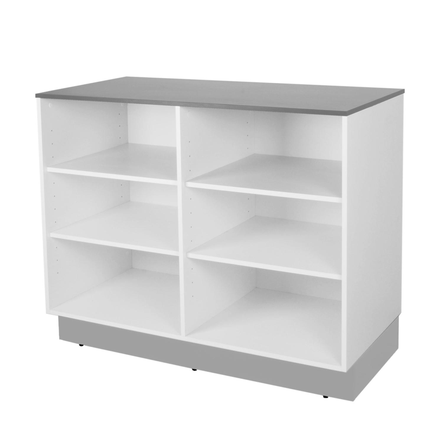 1180x600x970 mm. Vit front, sockel i borstad melamin. Grafitgrå toppskiva. 6 st hyllor. Kan kombineras med låda 42-41590. Levereras omonterad.