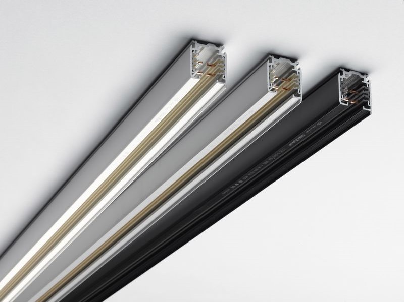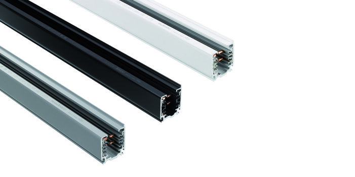 3-fasskena tillverkad i aluminium. Monteras dikt tak med takfäste eller med wirependling minst 2.2 meter över golv. Skenans öppning får ej vara riktad uppåt.