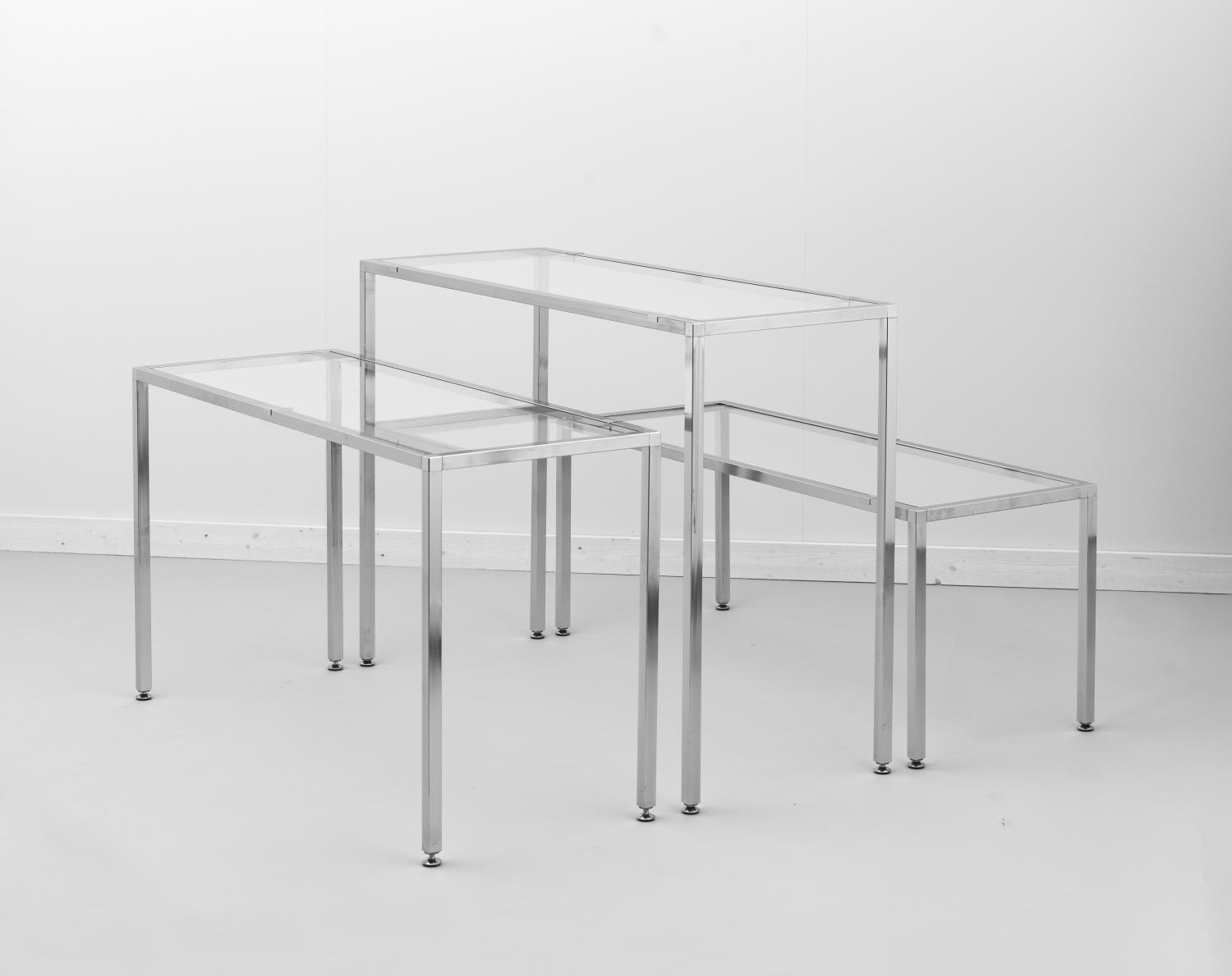Krom. Fyrkantigt system att bygga bord, väggställningar och podier efter eget önskemål.