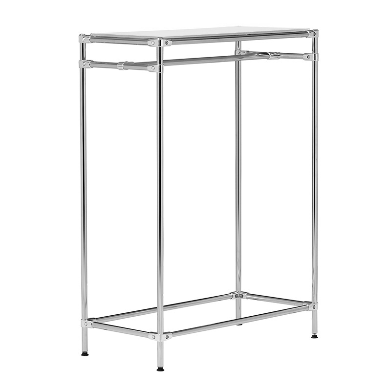 25 mm kromat golvställ med hylla. Höjd 1320 mm, längd 960 mm, djup 460 mm. Kan byggas i andra mått. Prisexempel på bilden.