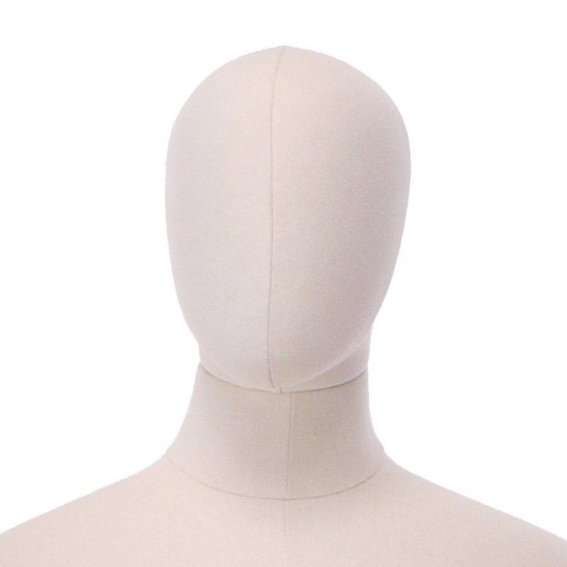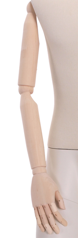 Meta skyltdocka med flexibla armar av obehandlat trä. Överkropp klädd i linnetyg.